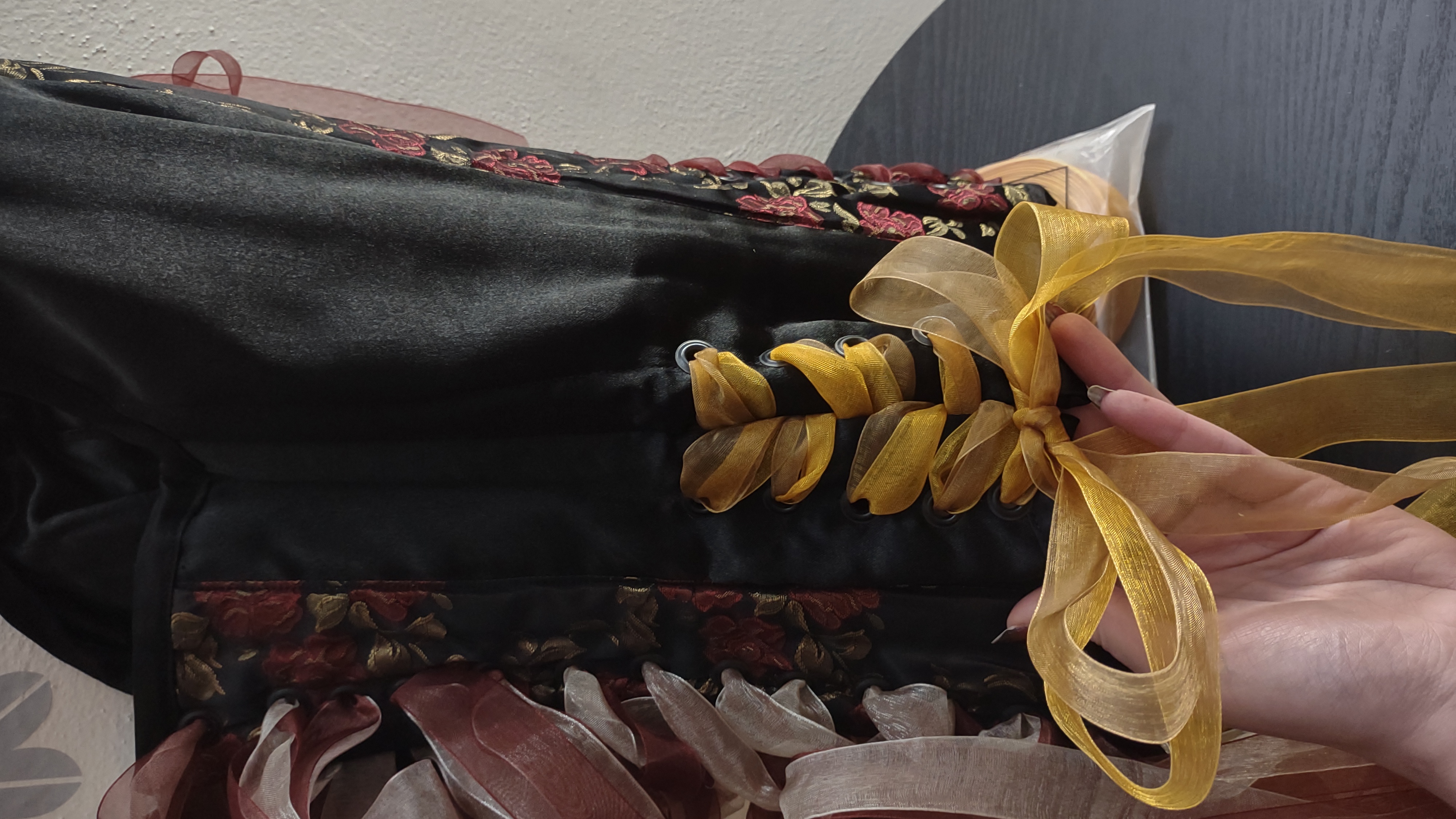 It will come w/ extra ribbon & cord. Dry clean only. Has hidden loops to hang it from for storing.