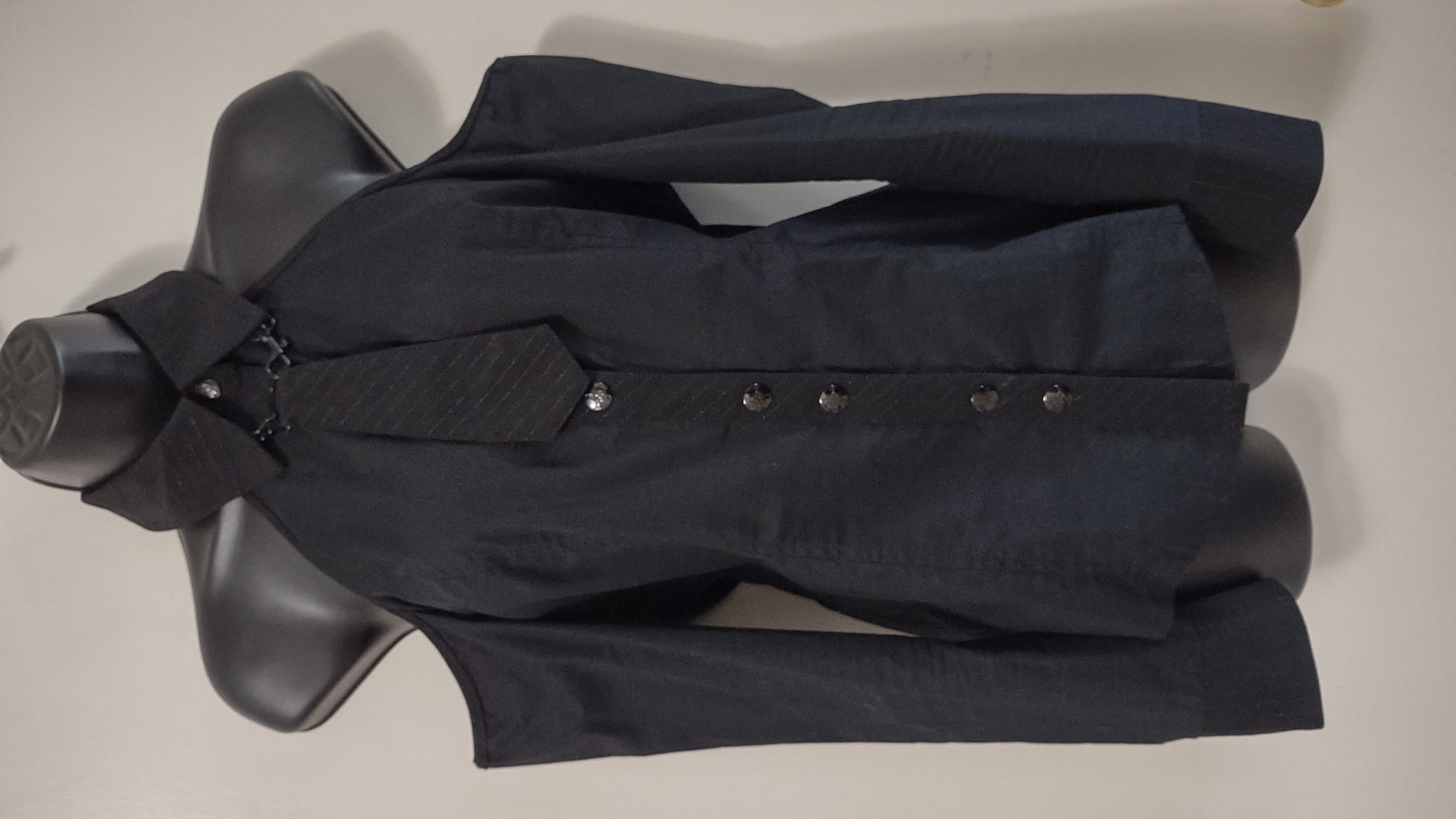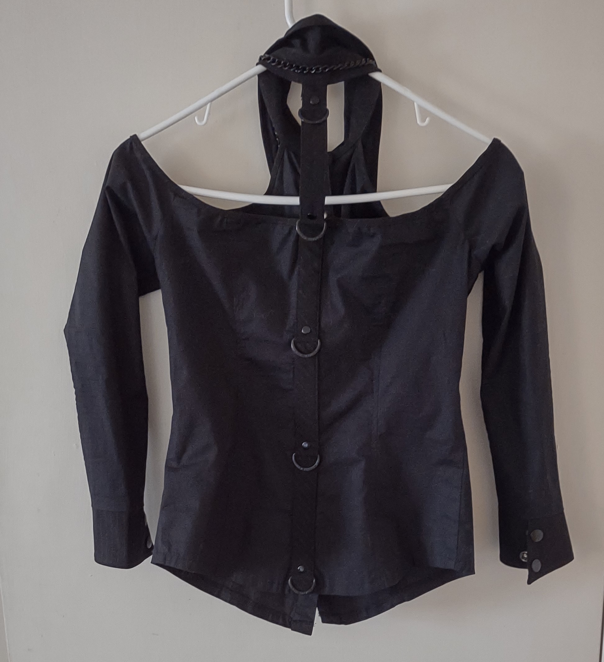 Button down black long-sleeved shirt with a removable necktie on a black chain.